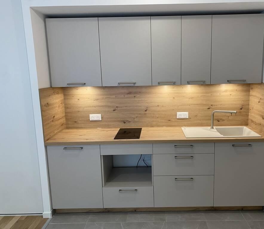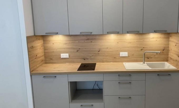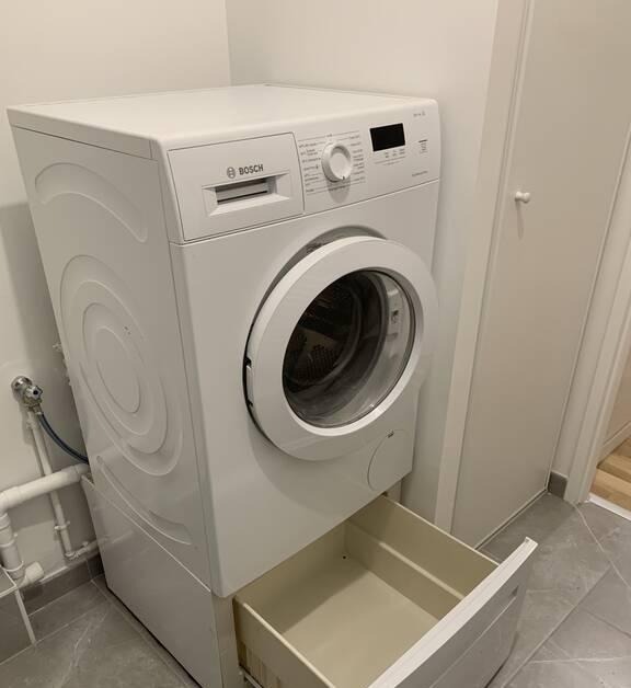 La cuisine comprend des plaques à induction Bosch, un four mixte micro-ondes/traditionnel Bosch et un réfrigérateur Liebherr. La salle d'eau dispose d'une grande douche, d'un ensemble lavabo/WC et d'une machine à laver Bosch. Le séjour est aménagé avec canapé 3 places convertible (160x200, matelas Dunlopillo), fauteuil cabriolet, table en verre réglable, chaises et TV.